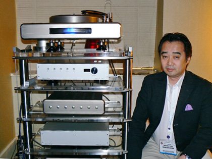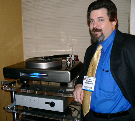 Signals-SuperFi's Chris Sommovigo poses with the new Continuum Criterion turntable and Copperhead Tonearm ($51,500). Well, he <I>is</I> the importer, after all. However, he is also the designer and manufacturer of Stereovox cables, and he had new AC cables, speaker cables, and interconnects to tout— Dragon AC ($3500), Dragon speaker ($11,000/pair), and Dragon interconnect (tbd). Why didn't he pose with his stuff?