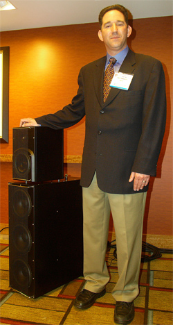 Krell Industries' new Modulare Duo loudspeaker system was the one active exhibit in their suite, playing music from an excellent sampler of audiophile favorites. Todd Eichenbaum, shown standing next to the $35,000/pair, 300 lb system, explained that the separate woofer and satellite units were made of machined billet aluminum, as with Krell's original LAT-1 speaker system, but the Modulare’s drivers and passive crossover circuitry have been designed for higher current handling. The low-frequency cabinet contains three 8" aluminum-cone woofers, while the satellite section marries a 1" ScanSpeak ring-radiator tweeter, and a 6.5" aluminum-cone midrange driver.