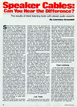 It's not often that you get a chance to have extensive discussions with the horse's mouth, but we recently had that opportunity. Since July of this year there has been extensive discussion in the audio community, particularly the high-end segment, of Larry Greenhill's <A HREF="http://bruce.coppola.name/audio/Greenhill.pdf">article on speaker cable listening tests</A> in the August, 1983 issue of <I>Stereo Review</I> (footnote 1). From recent talks with author Greenhill we've learned that the most interesting story was <I>not</I> in <I>Stereo Review</I>; instead it can be found in the varying reactions from different quarters, and what they say about the high-end industry in general.